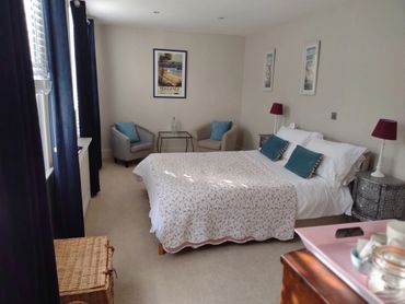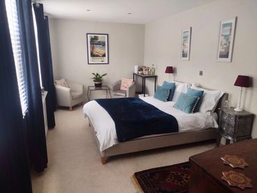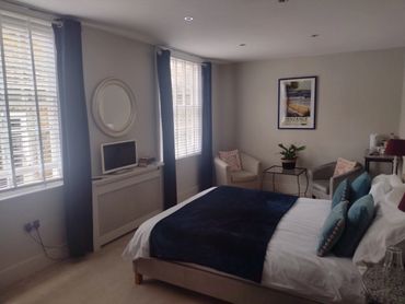 The large, light beautiful bedroom has two original sash windows fitted with blinds and blue velvet black out curtains to offer cosiness at night. A king size bed with high quality mattress, pillows and bed linen. With a seating area complete with two arm chairs and glass table. A coffee and tea tray with fresh milk and fresh coffee, biscuits, tea and mint tea. Tv with fire stick and access to Netflix and other channels. Th ebedroom door is lockable by a chub key when you leave the room and lockable within. Fitted carpets and central heating to add to your comfort. Free Wifi.