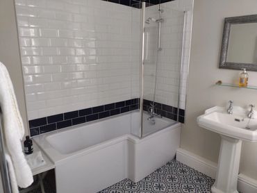 The elegant ensuite bathroom offers an extra large bath with constant hot water. with a handset/ powerful shower with a glass screen. Large basin, WC and heated towel rail . Gowns provided.